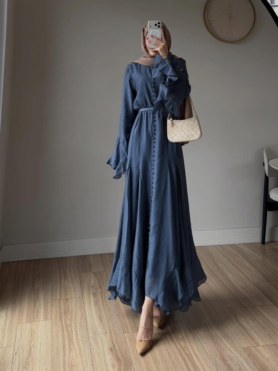 Elbisenin 140 cm uzunluğu, zarif bir siluet oluşturur ve şıklığı artırır. Ayrıca, ürüne dahil olan kemer, belin vurgulanmasına yardımcı olarak, feminen bir görünüm kazandırır. Mankenin 173 cm boyu ve 50 kg ağırlığı, elbisenin üzerindeki duruşunu sergileyerek, potansiyel alıcılara referans noktası sunar.