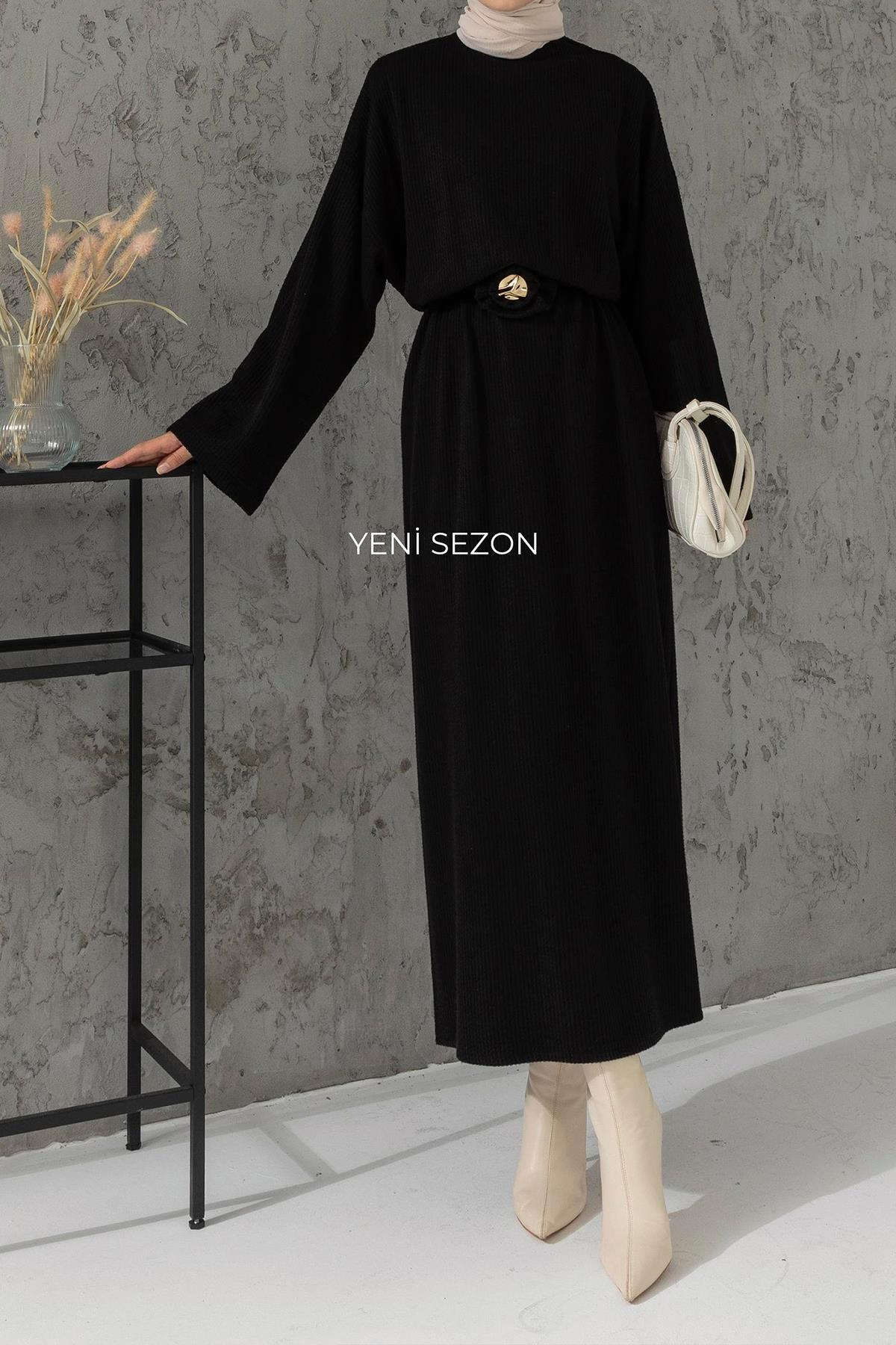 FİTİLLİ KUŞAK DETAY ELBİSE SİYAH (6530)