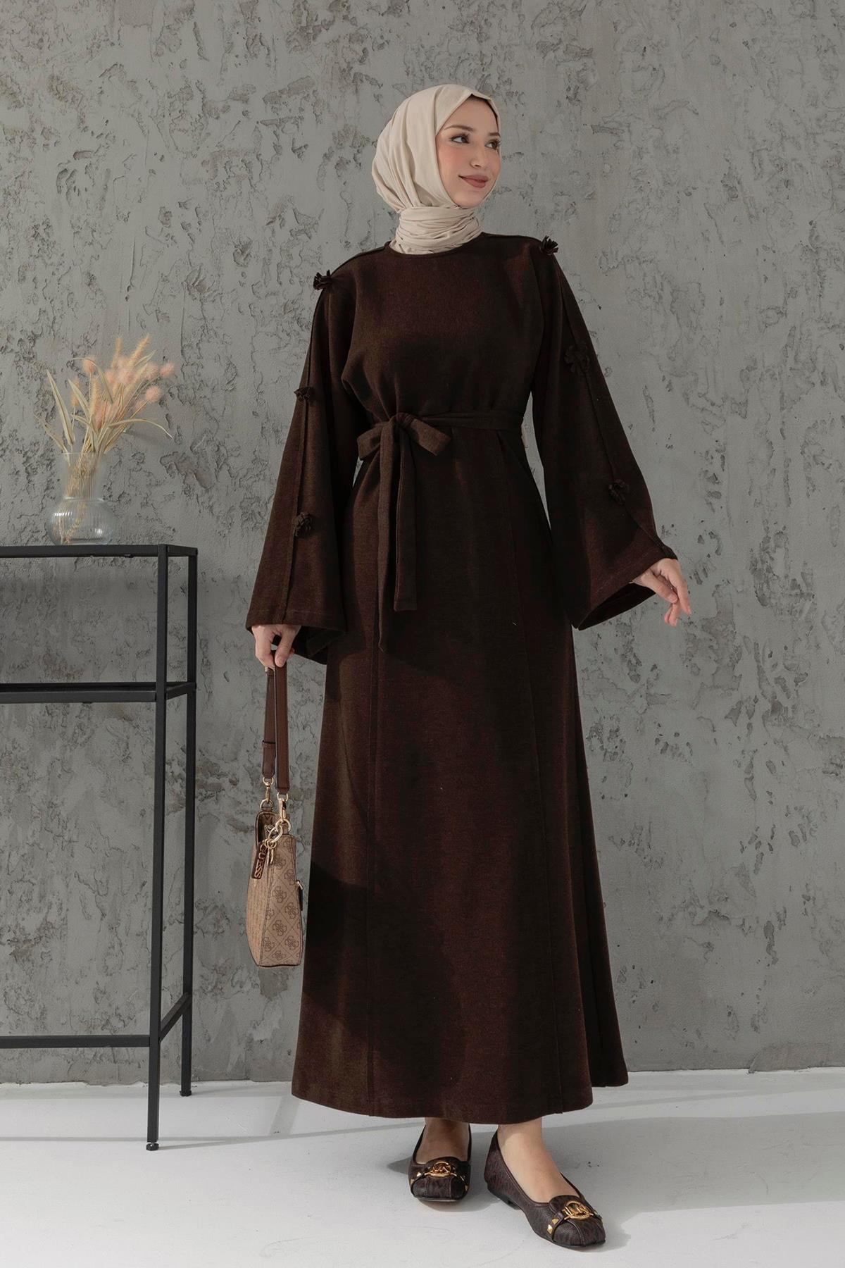 SACAK DETAYLI KEMERLİ ELBİSE KAHVE (6536)