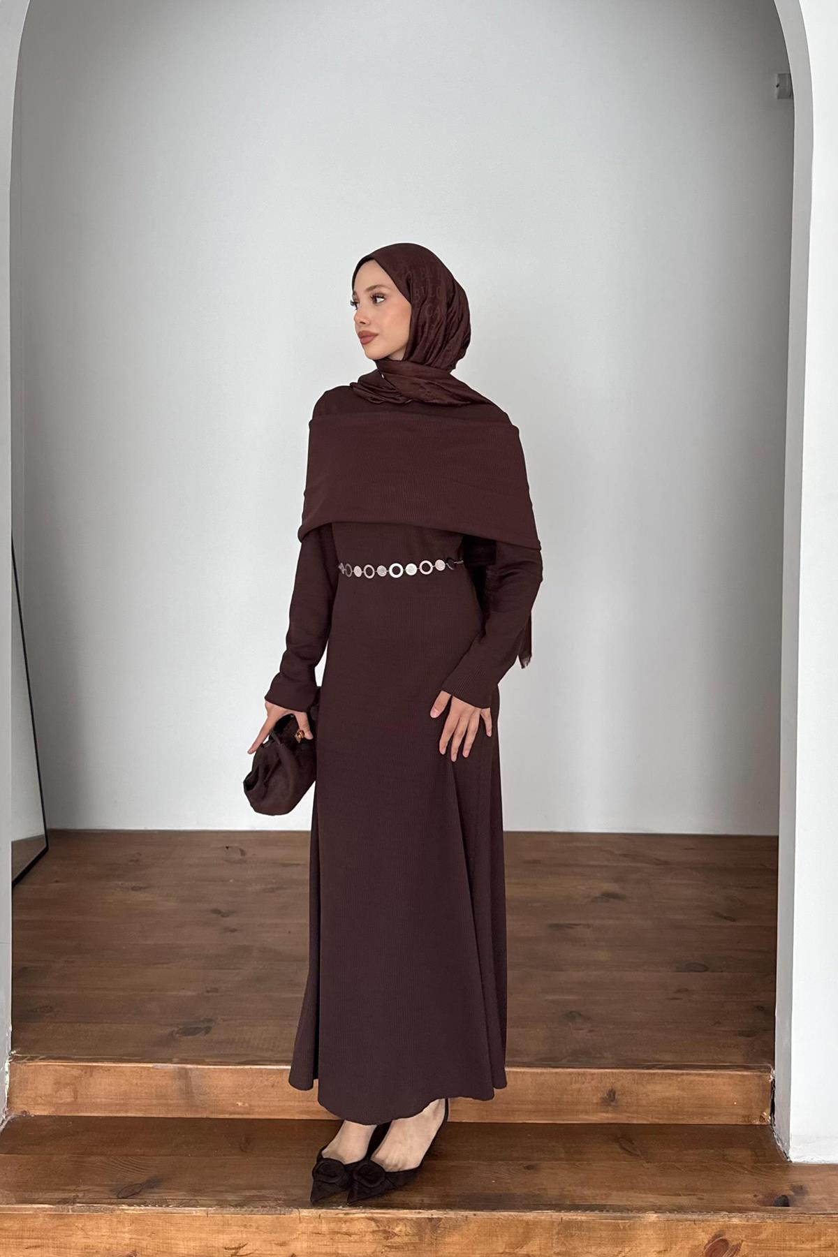 ZİNCİR AKSESUARLI FİTİLLİ ELBİSE KAHVE